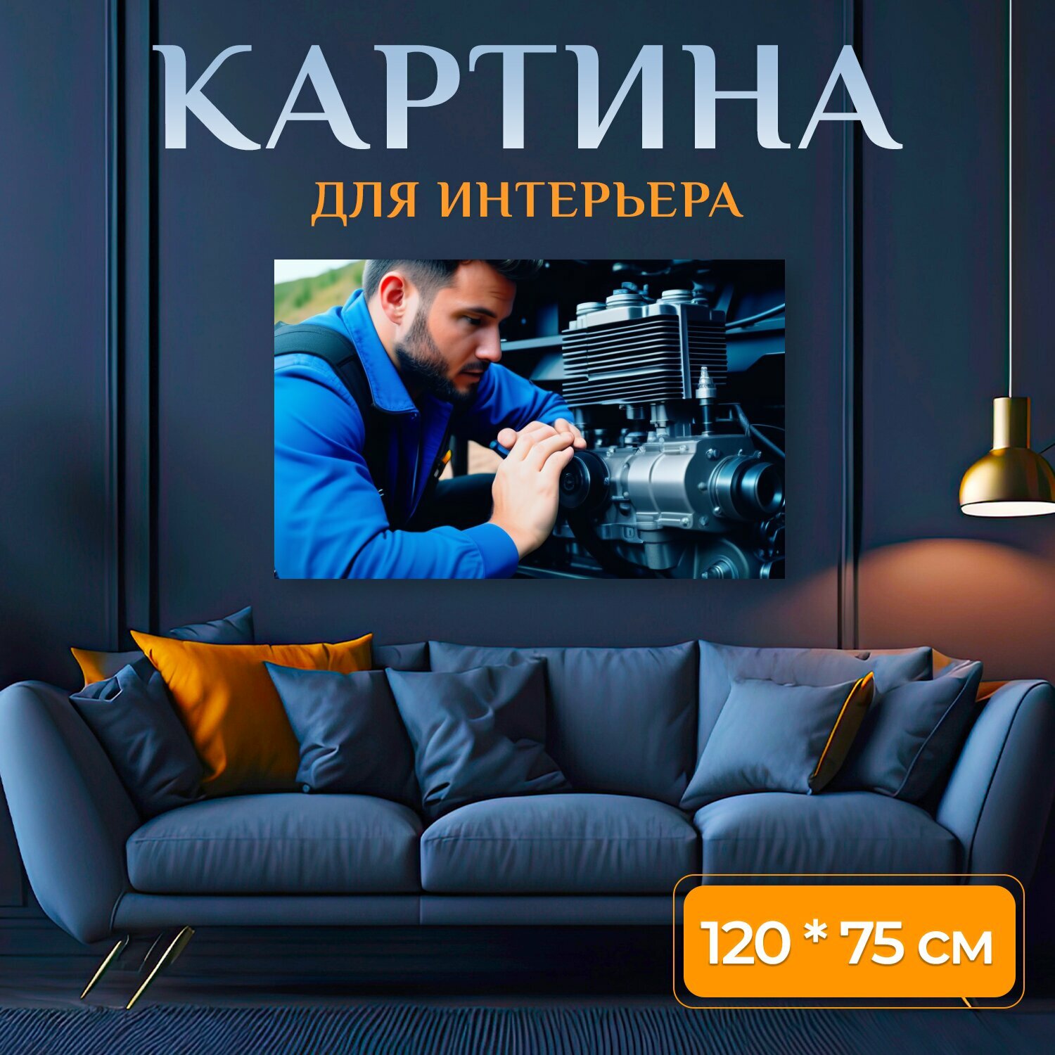 Купить Картина на холсте в автосервис "Механик слушает двигатель внедорожника , " на подрамнике 120х75 см. для интерьера