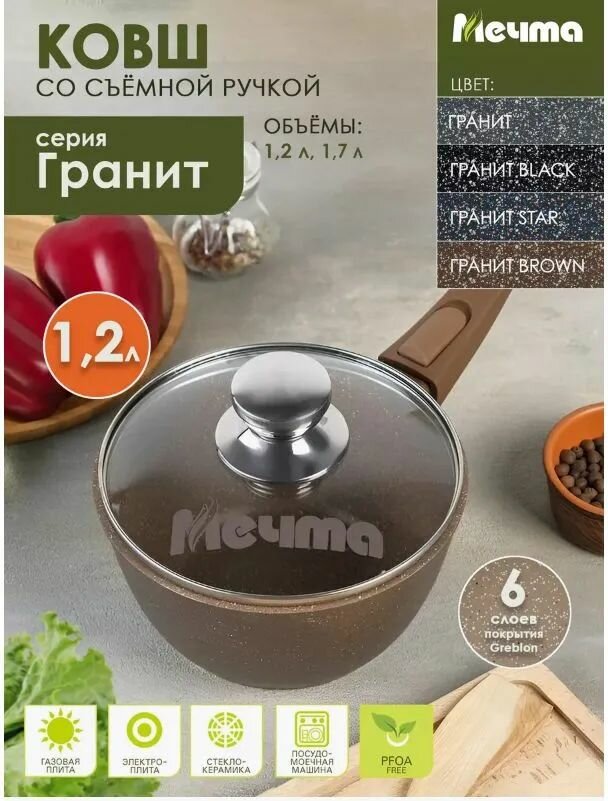 Ковш Мечта 1.2 л Гранит с антипригарным покрытием со съемной ручкой и крышкой, НЕ индукционная
