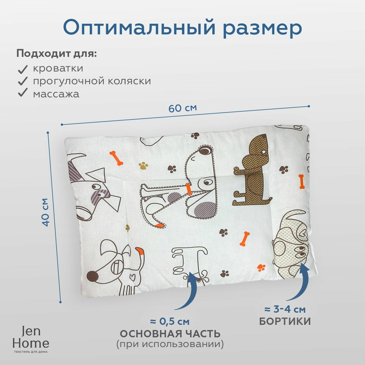 Купить Подушка для малышей, гипоаллергенная 40х60 "Собачки" плоская 0+