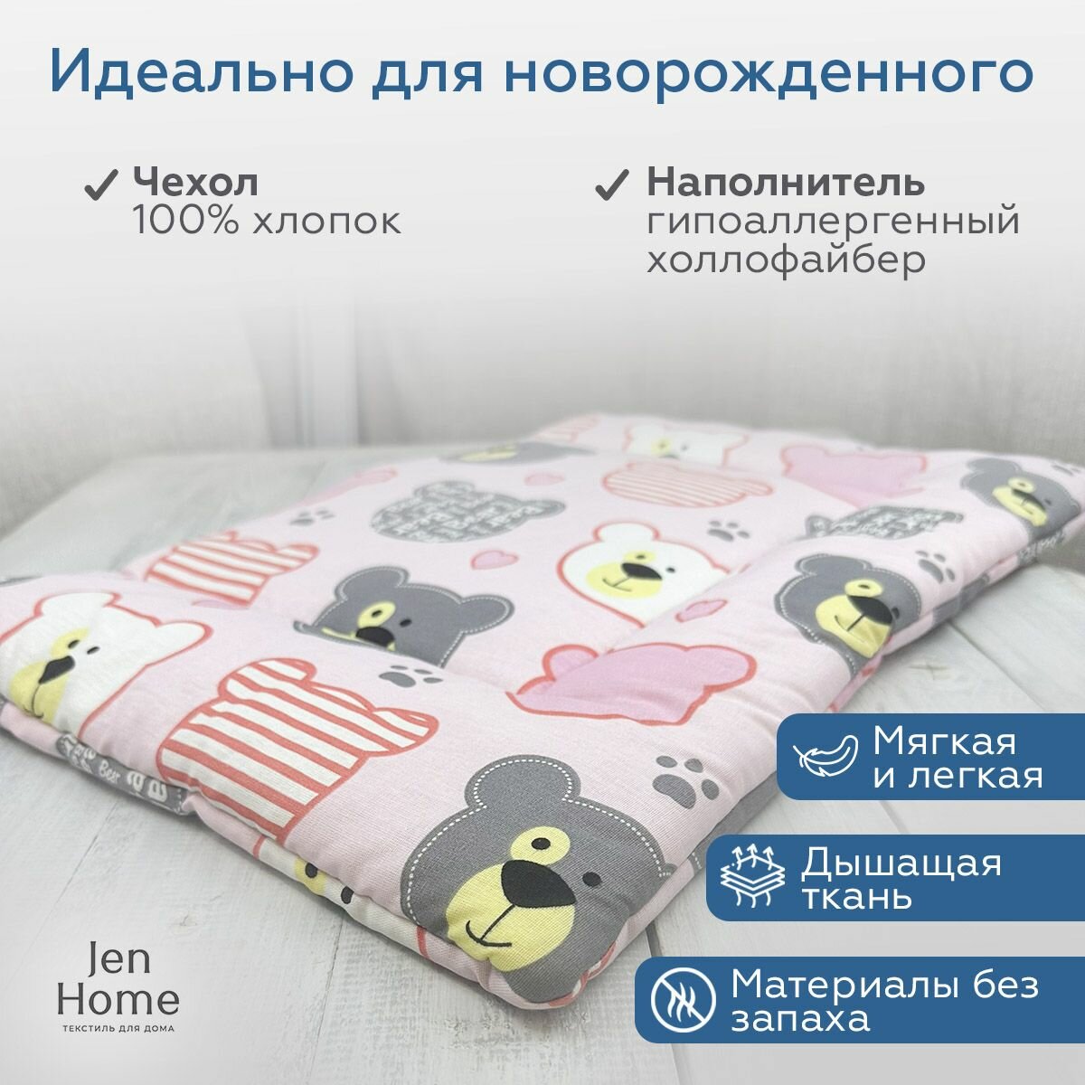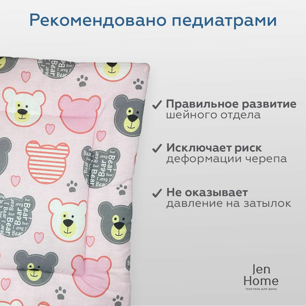 СохранитьПодушка для малышей, гипоаллергенная 40х60 "Мишки на розовом" плоская 0+ интересное: