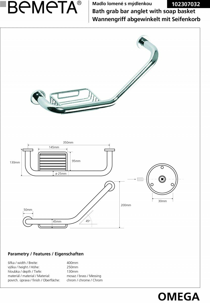 Поручень Bemeta Omega 400, изогнутый, с мыльницей, хром 102307032