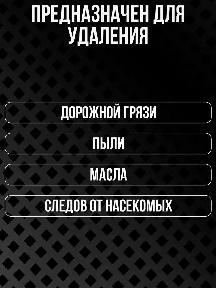 | Плюсы: | Хорошая плотная пена, за пару минут откисают все размазанные насекомые и смываются без усилия |