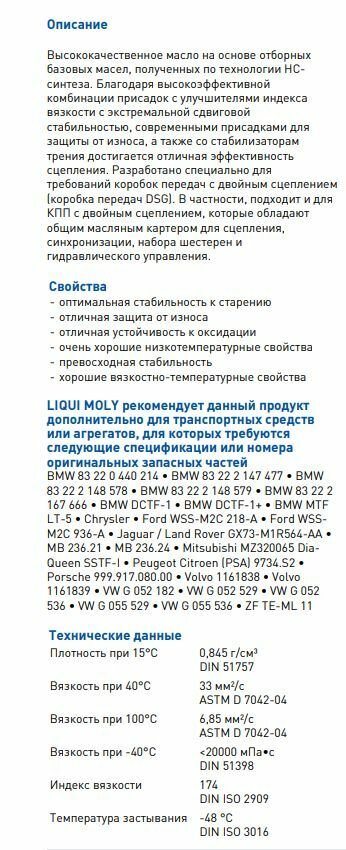 LIQUI MOLY 3640 Снят, замена 39019 НС-синт. тр.масло для DSG Doppelkupplungsgetriebe-Oil 8100 (1л)