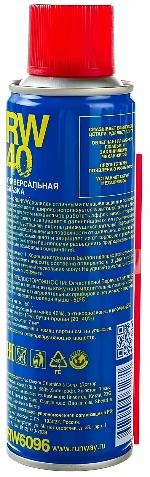 Смазка универсальная RW-40 200 мл, аэрозоль с трубочкой, RUNWAY RW6096