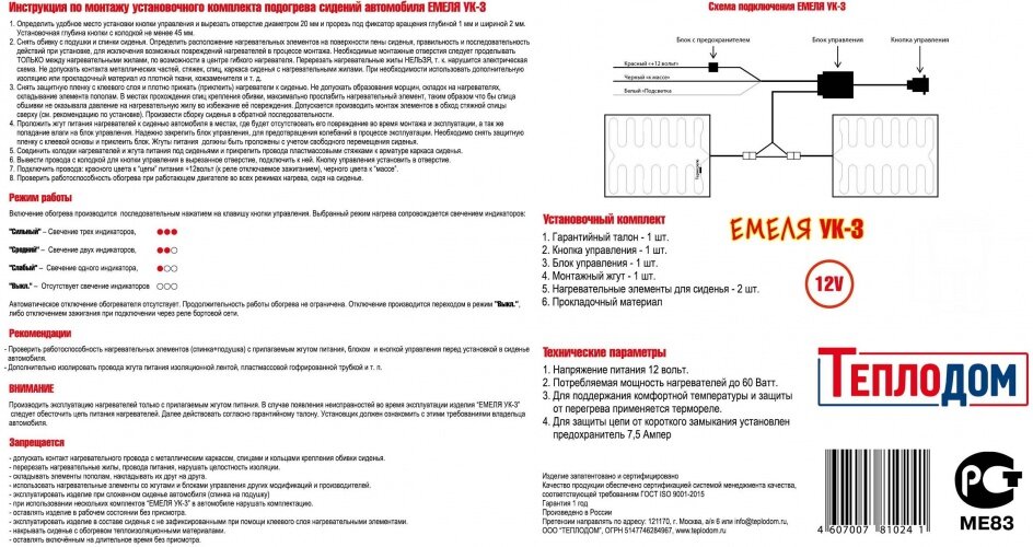 Установочный комплект емеля УК-3 2 нагревателя, 1сиденье, 3 режима