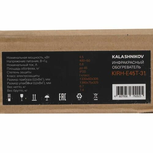 Обогреватель ИК KALASHNIKOV KIRH-E45T-31/4,5кВт/45м2/открытый излучатель IP20/h установки 15м/380В