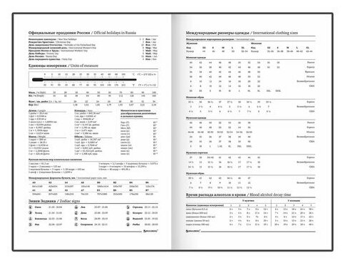 эргономичный приятный на вид хорошее качество Недостатки: недостатков не обнаружил отличный ежедневник имеет в себе много полезной информации такой как время распада алкоголя в крови автомобильные коды регионов коды автоматической междугородней и международной связи также питание и расход калорий единицы измерения имею такой дома и на работе |