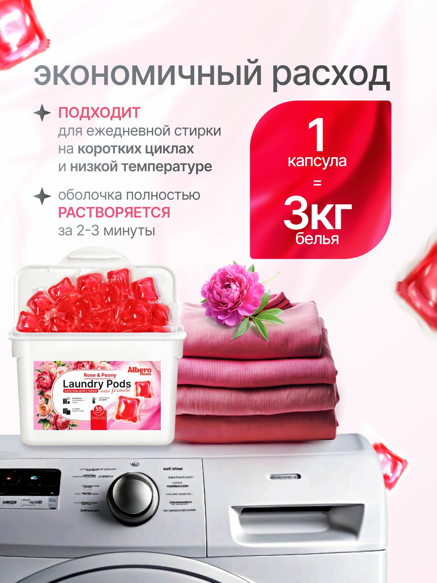 Купить Капсулы гель для стирки белья с кондиционером аромат Пиона, против пятен с формулой защитой цвета антибактериальные / стиральный порошок для всех видов ткани 55 капсул