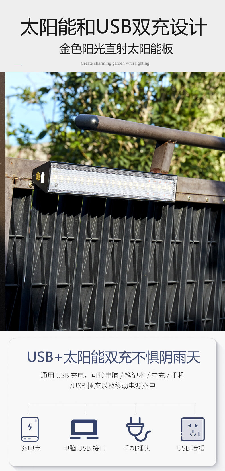 Фонарь GT230A, черный, с регулировкой освещенности, для сада, USB, защита от дождя