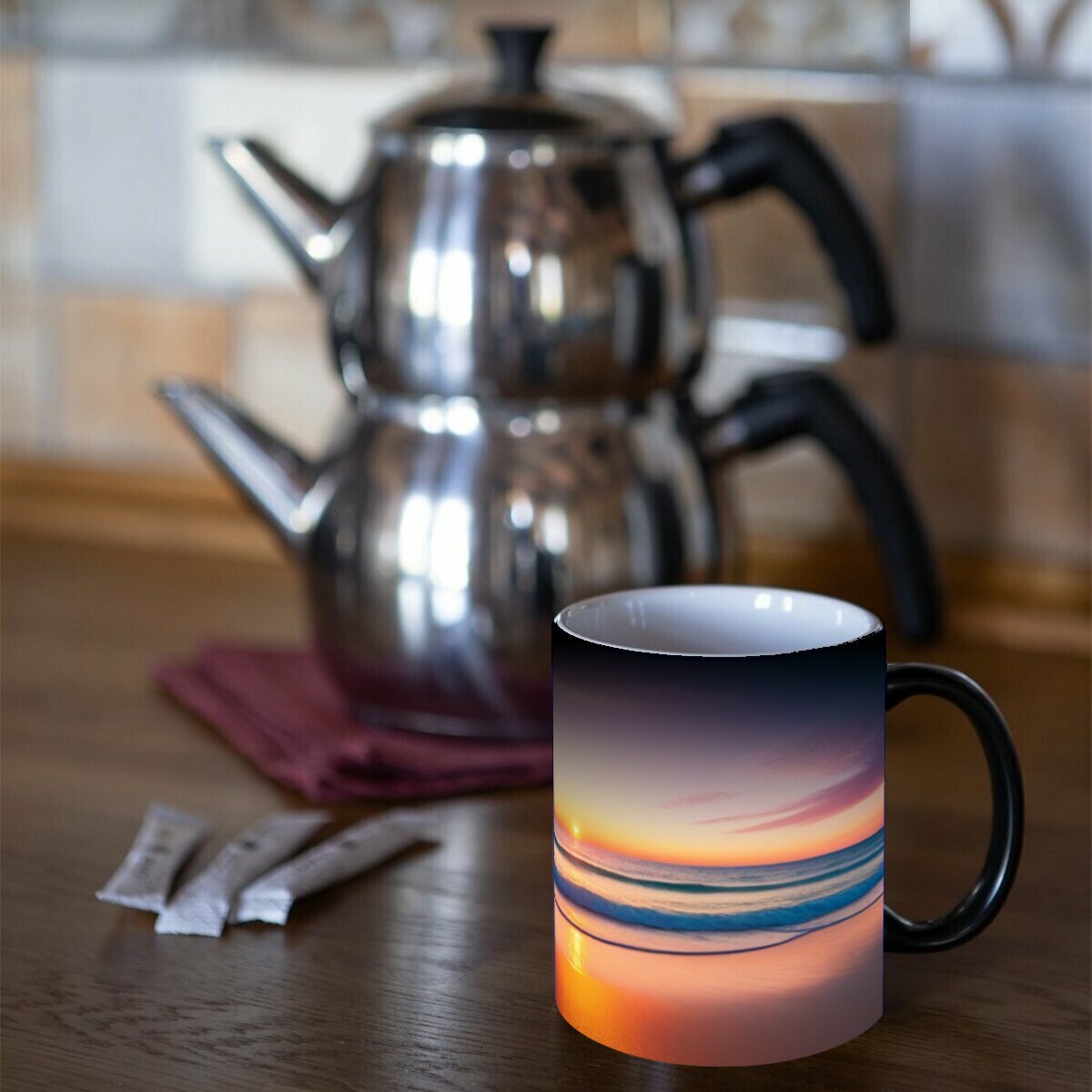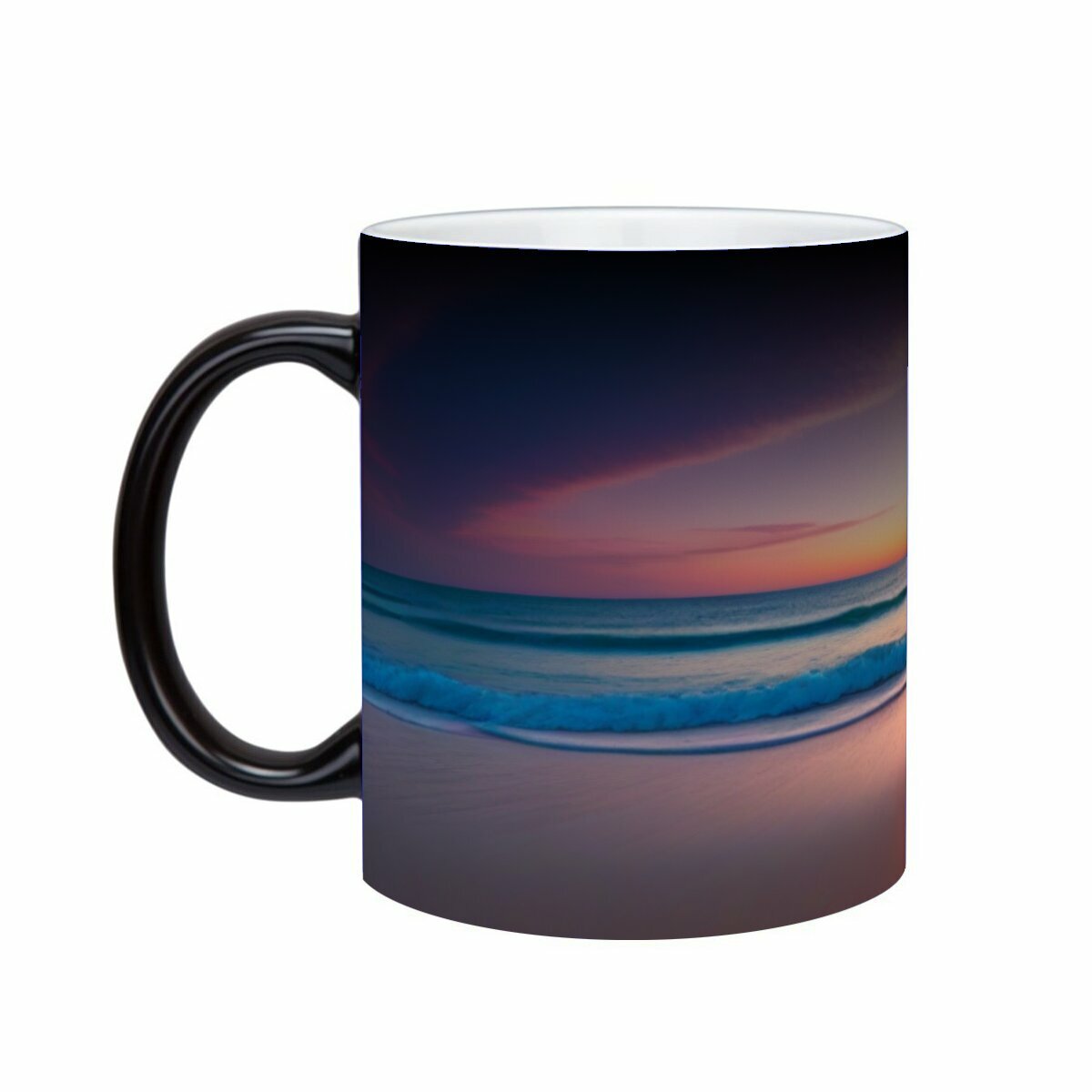 Купить Кружка хамелеон с принтом "Закат над спокойным пляжем" 330 мл.