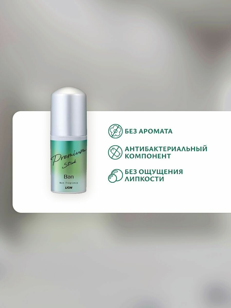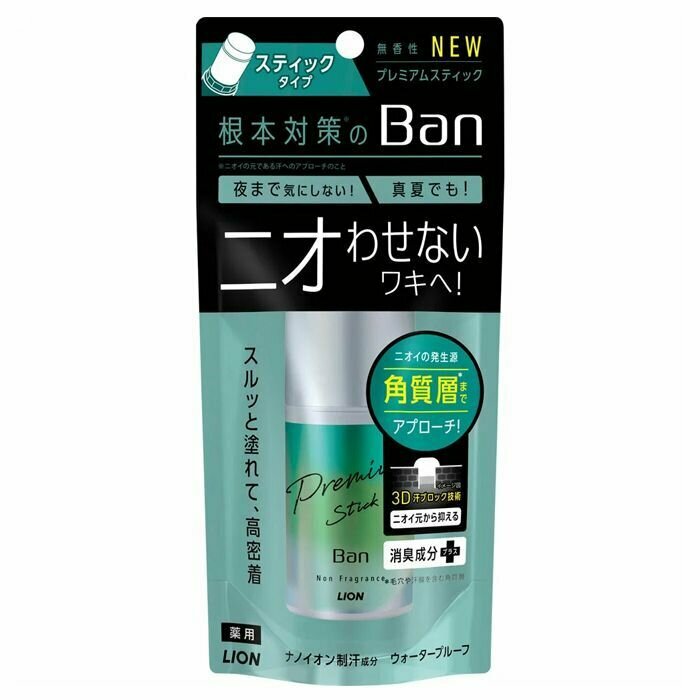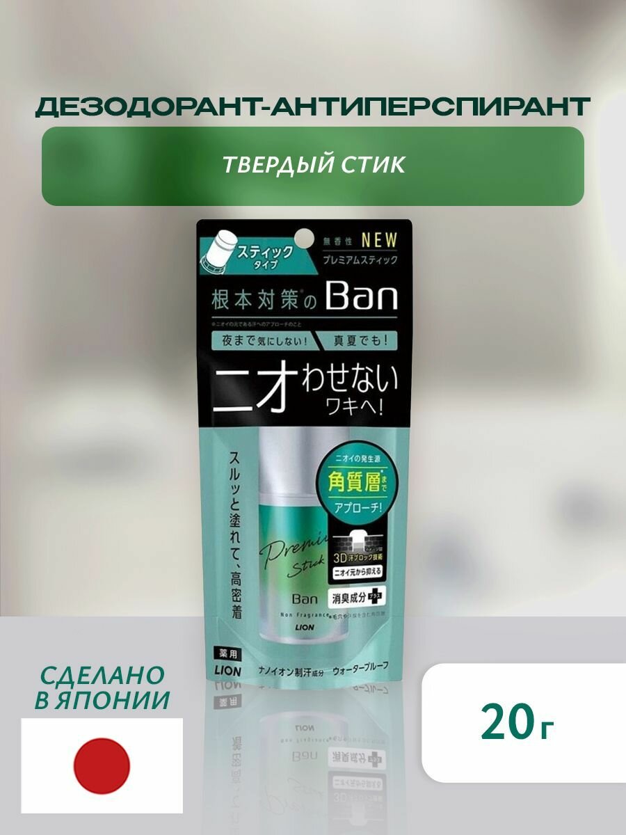 Lion Премиальный твёрдый (стик) дезодорант-антиперспирант, ионный, блокирующий потоотделение "BAN Premium Stick", без аромата, 20 мл.