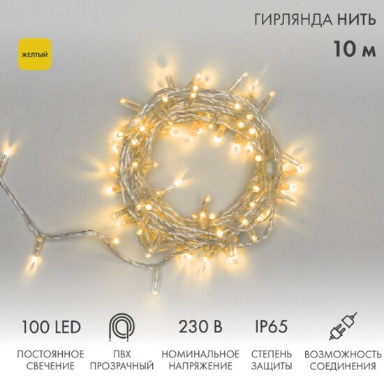 Гирлянда NEON-NIGHT 305-181 нить 10м, постоянное свечение, прозрачный ПВХ, 230В, цвет: жёлтый