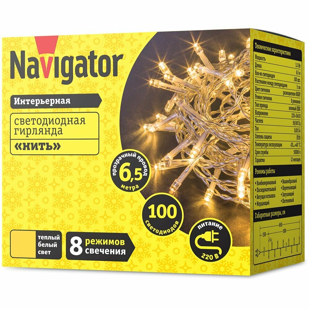 Гирлянда (LED) нить 6,5м 100LED бел. с контроллером Navigator