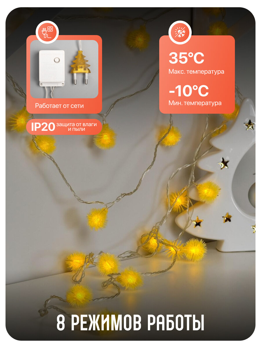 Гирлянда Нить 5 м с насадками Ёжики белые, IP20, прозрачная нить, 30 LED, свечение тeплое белое, 8 режимов, 220 В