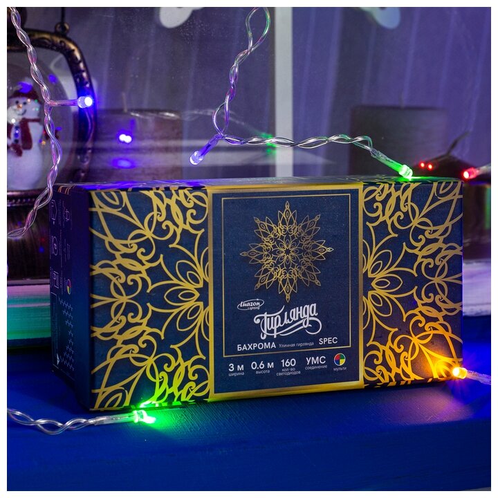 Гирлянда «Бахрома» 3 × 0.6 м, IP44, УМС, прозрачная нить, 160 SMD-LED, свечение мульти, 220 В (арт. 4356988)