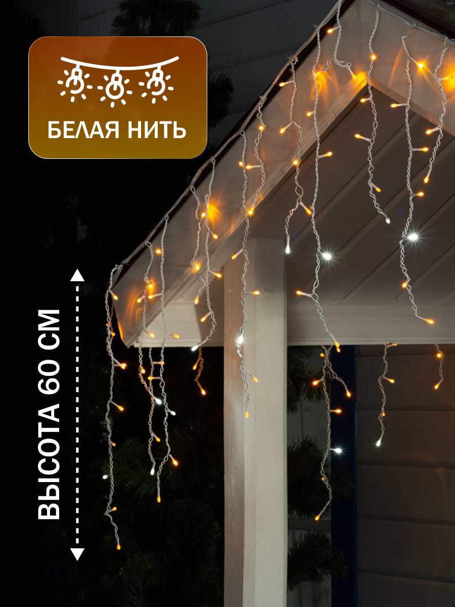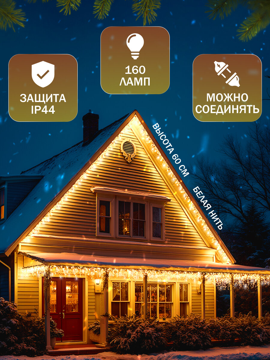 Гирлянда «Бахрома» 3 × 0.6 м, IP44, УМС, белая нить, 160 LED, свечение жёлтое, мерцание белым, 220 В