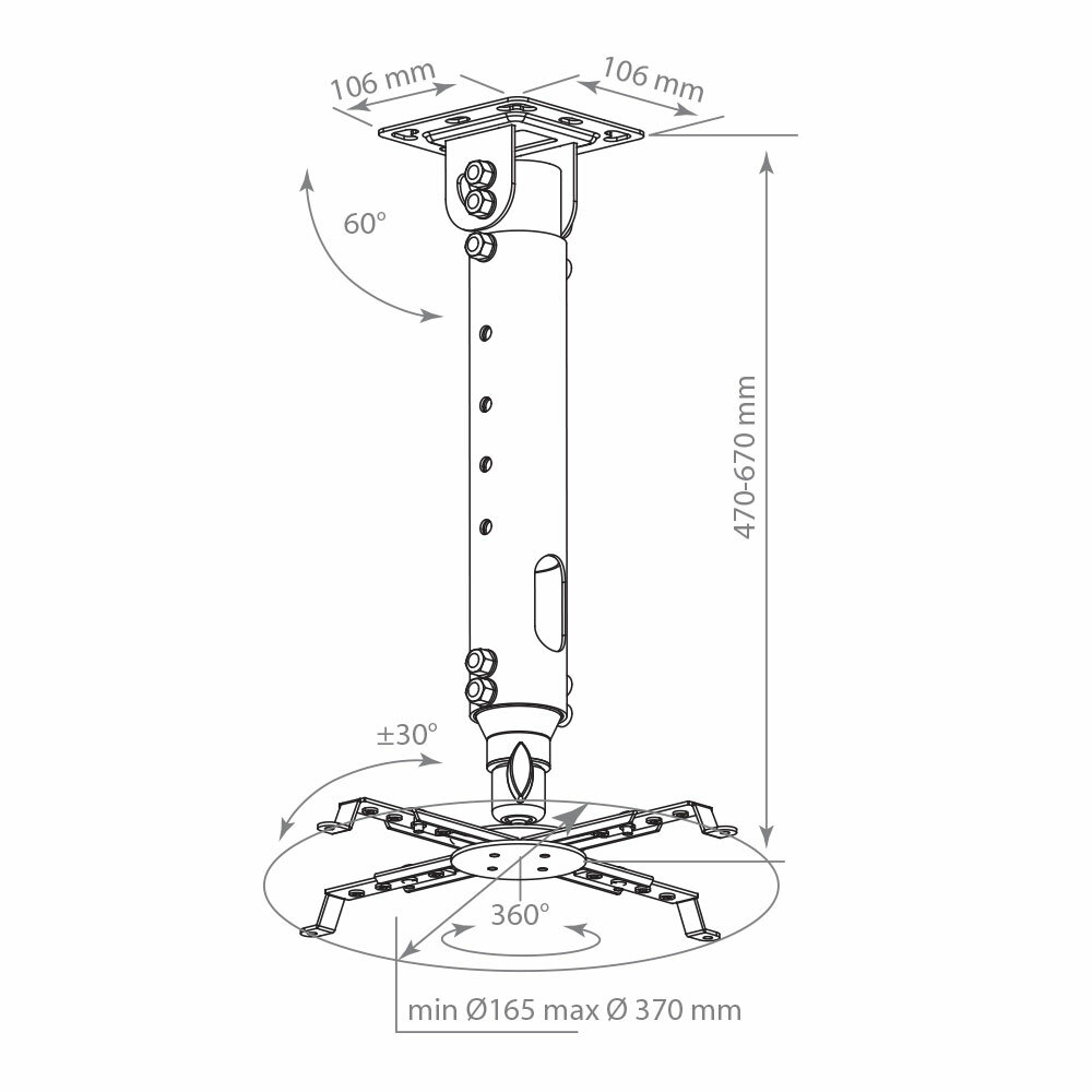 Кронштейн Kromax ProjectOR-100 ( Кронштейн для проекторов, все регулировки, расстояние от потолка до проектора 470-670мм.) Провода внутри штанги) Grey