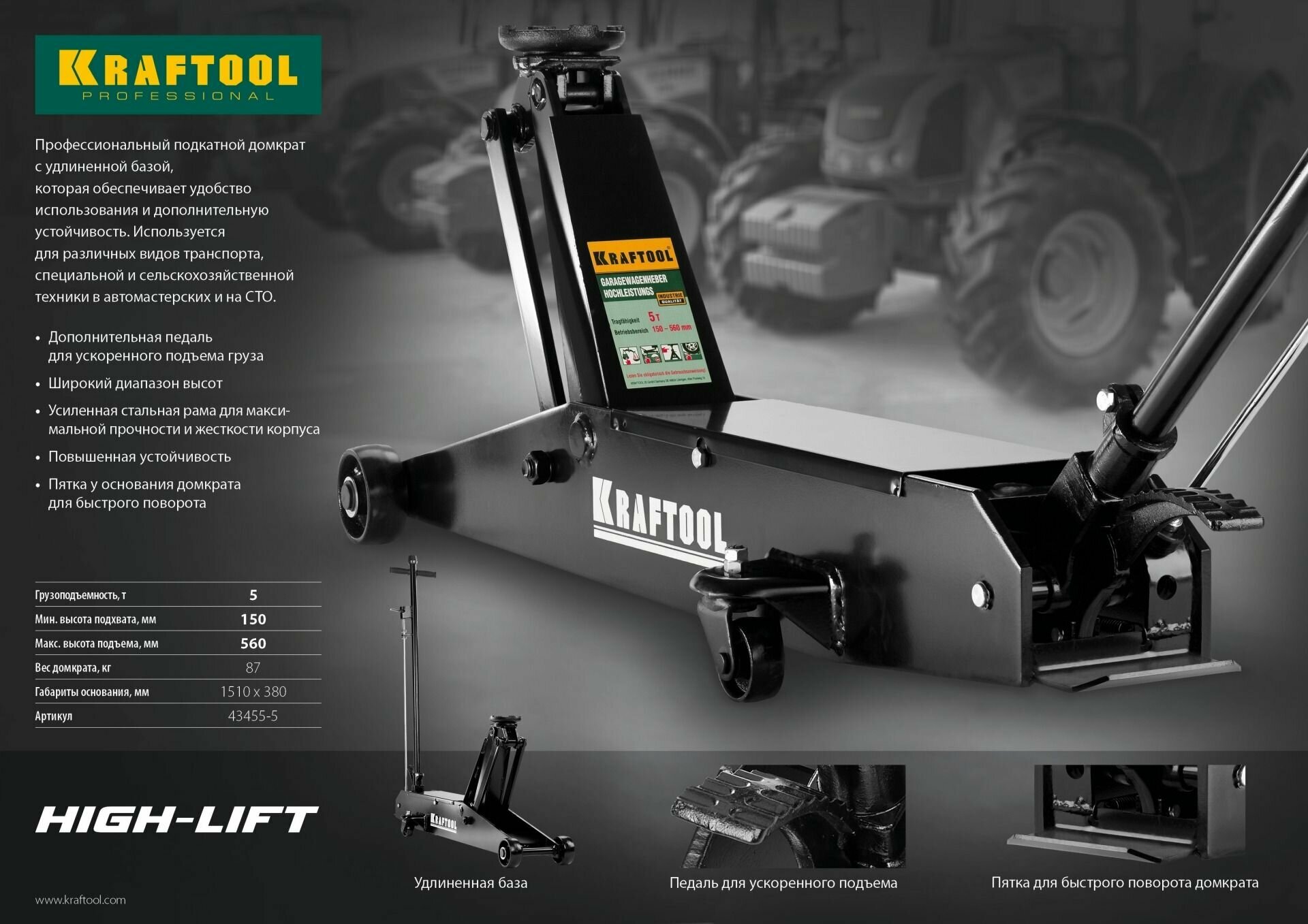 KRAFTOOL HIGH-LIFT 5т 150-560мм подкатной домкрат для тяжелой техники, 43455-5