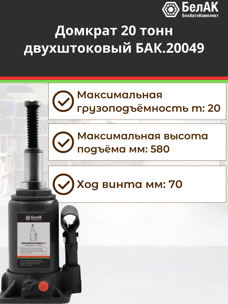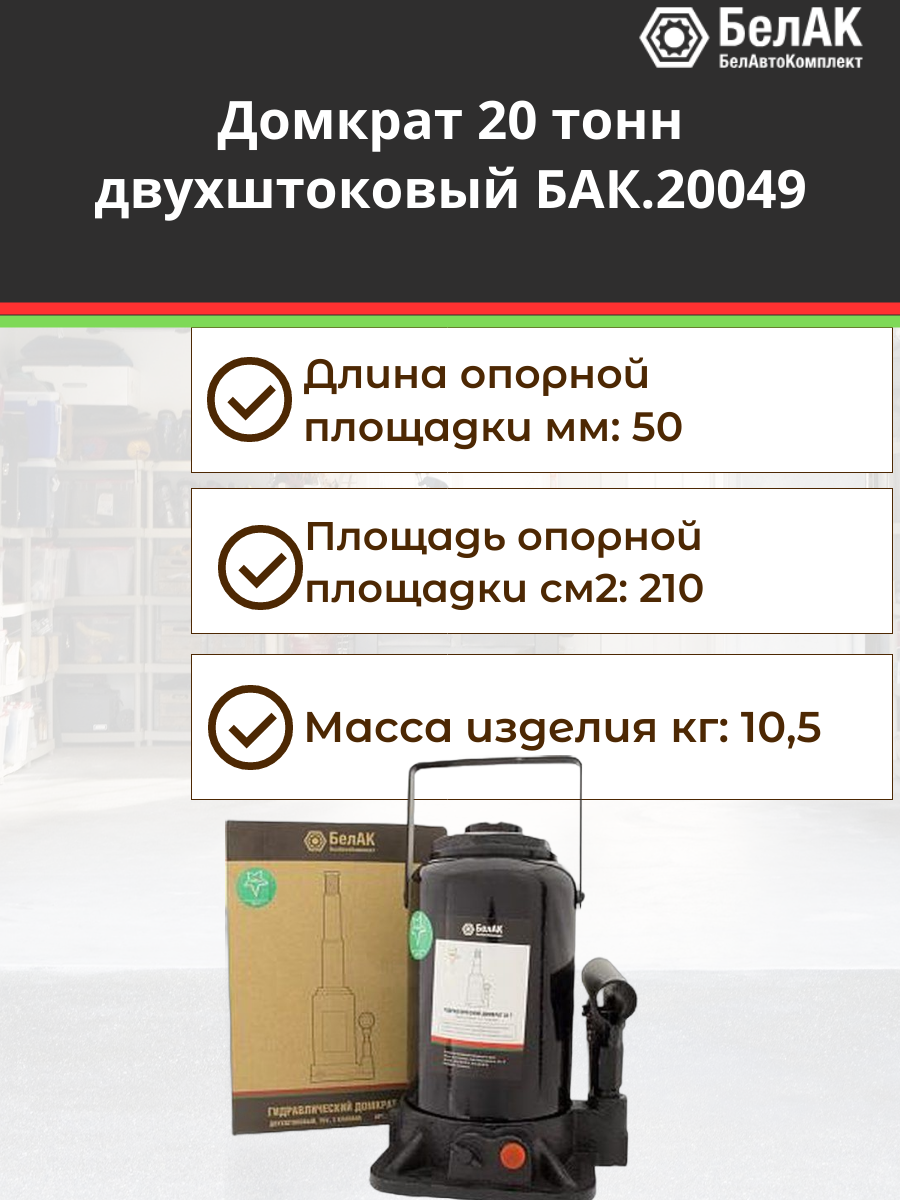 BAK20049 белавтокомплект БАК.20049_домкрат! бутылочный 20 тонн двухштоковый\