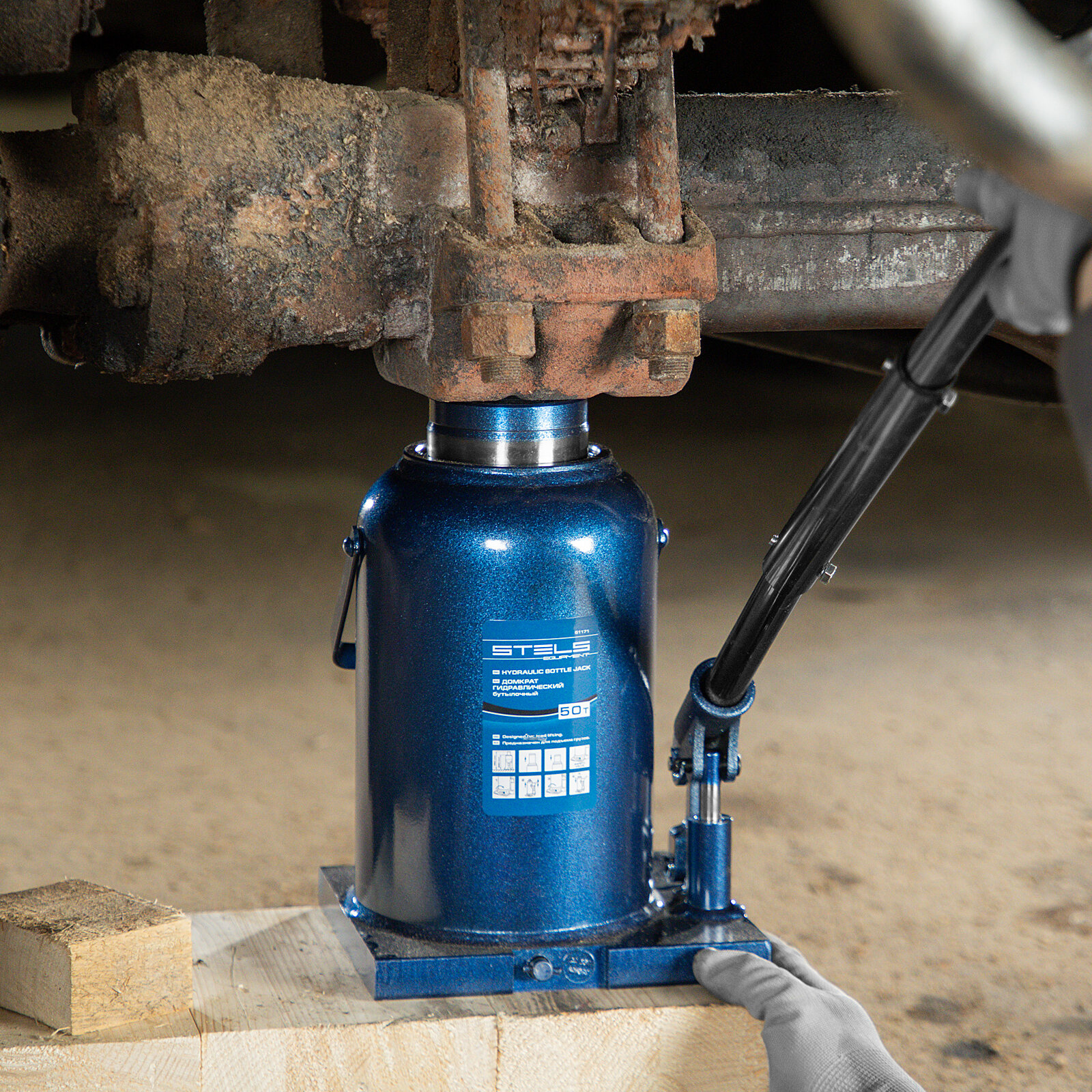 Домкрат бутылочный гидравлический Stels 51171 (50 т) синий