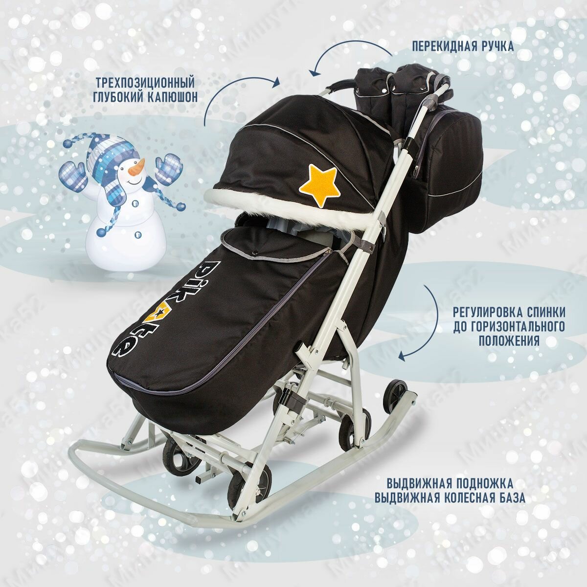 Санки-коляска Pikate Снеговик выдвижные колеса, перекидная ручка, сумка для мамы, цвет Шоколад