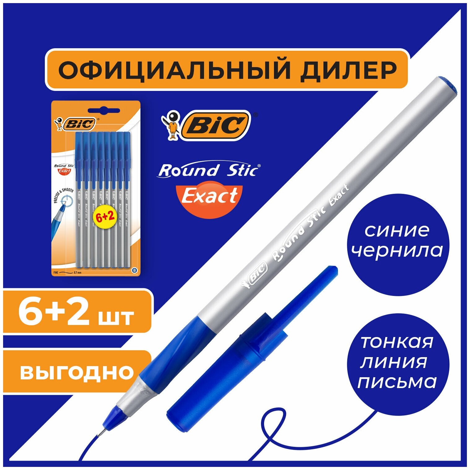 Ручки шариковые с грипом BIC "Round Stic Exact", набор 6+2 шт., синие, линия письма 0,28 мм, блистер, 932862, 143980