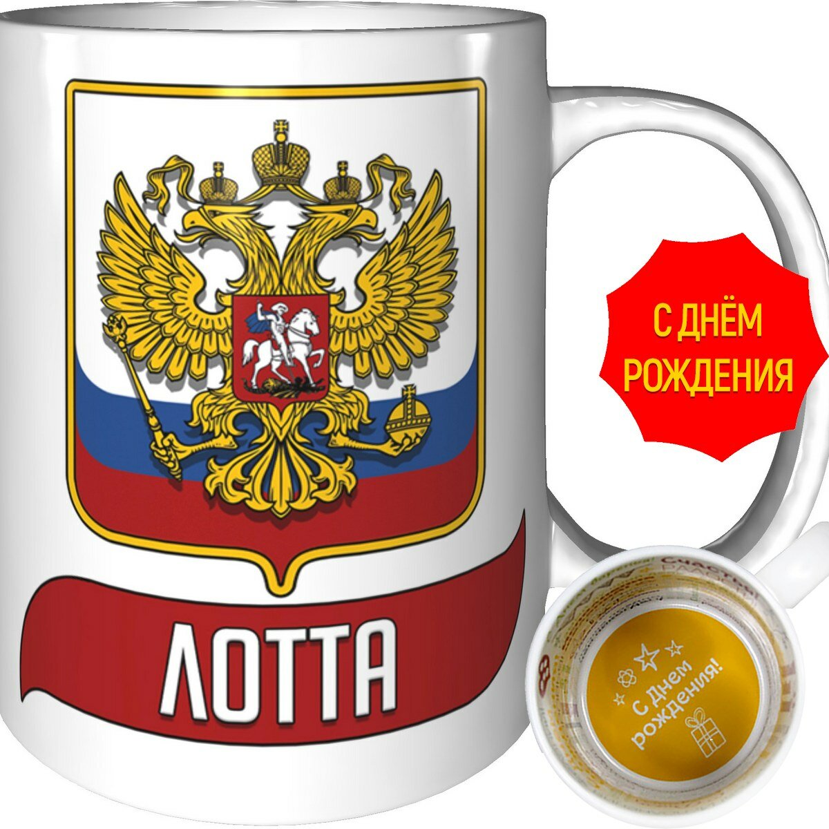 Купить Кружка Лотта с Флагом и Гербом России - с днём рождения внутри