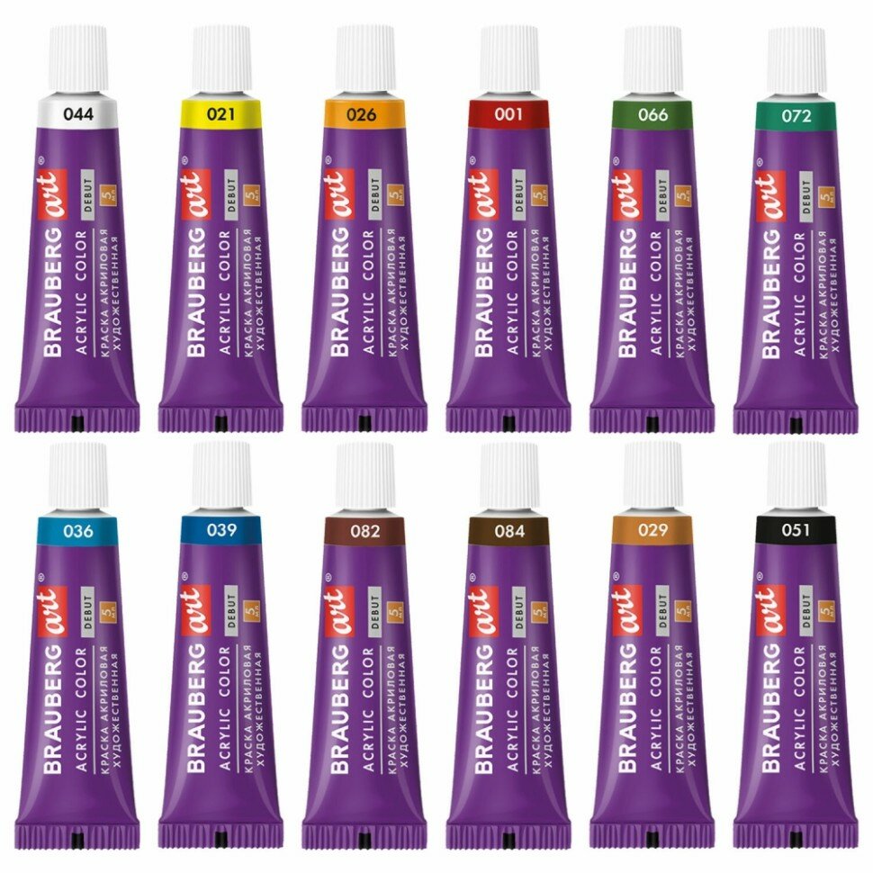 Набор из 4 шт, Краски акриловые художественные набор 12 цветов по 5 мл, в тубах, BRAUBERG ART DEBUT, 192385 (192385) интересное: