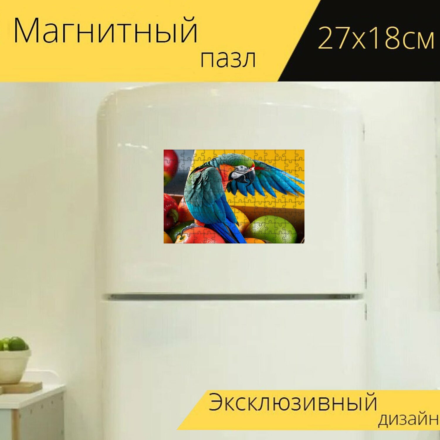 Магнитный пазл "Фрукты в яркой упаковке с попугаем на верхушке" на холодильник 27 x 18 см. интересное: