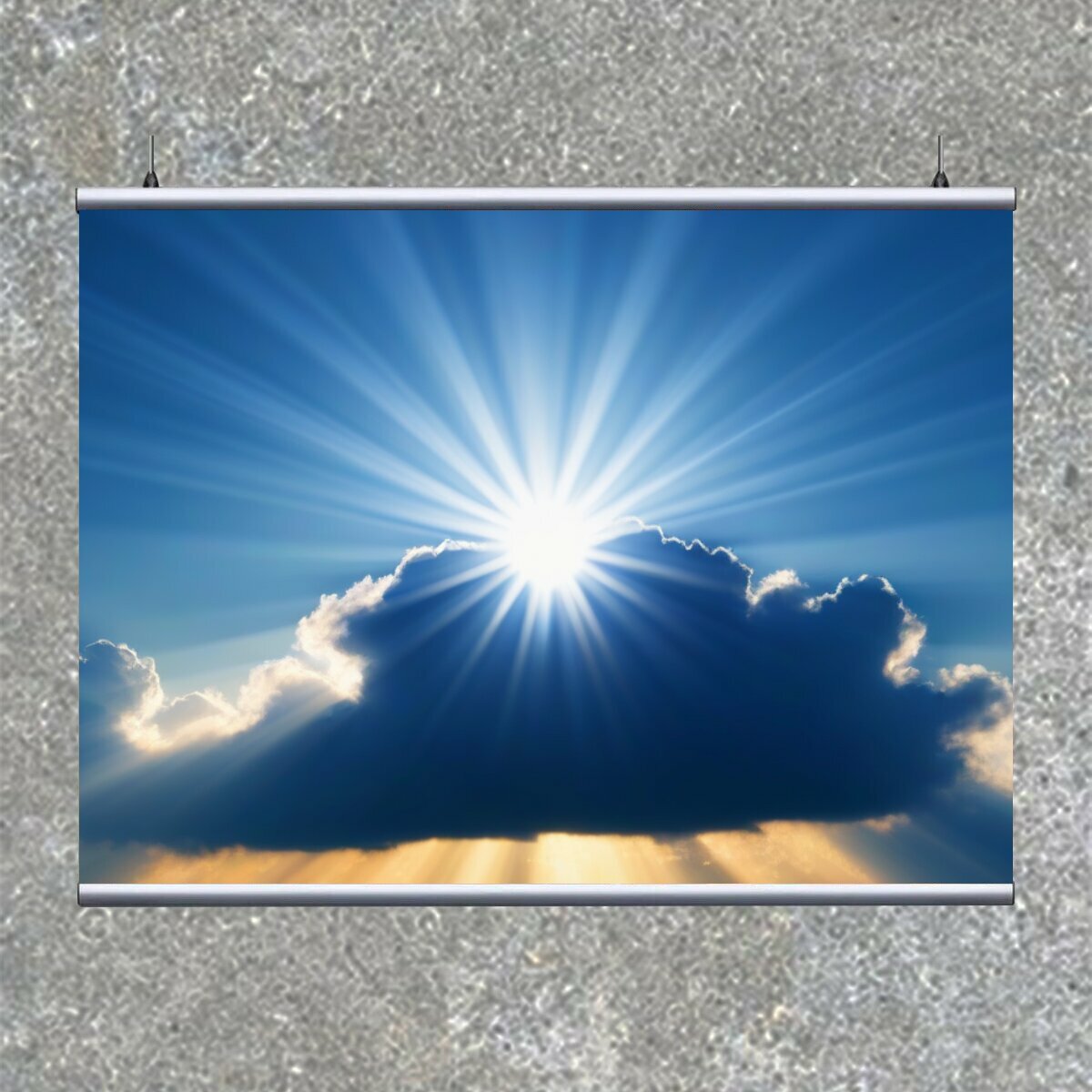 Купить Картина на холсте "Солнечные лучи, пробивающиеся через облака" с подвесами 120х90 см. для интерьера на стену