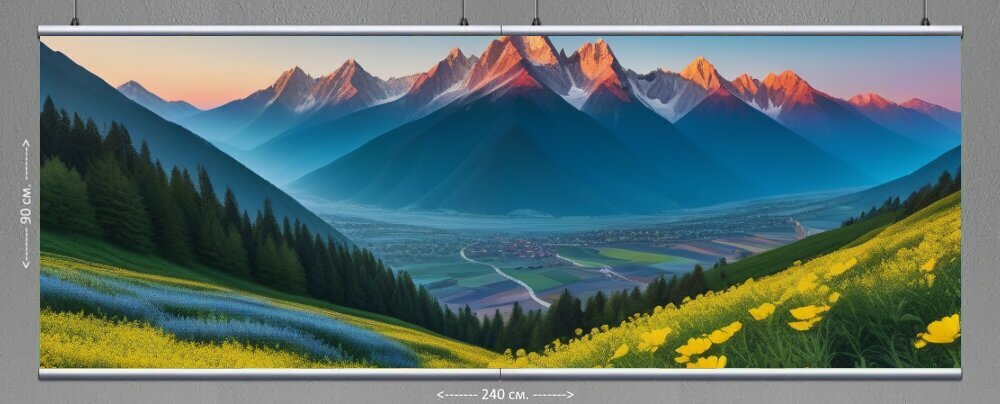 Картина на холсте "Расцветающий утренний пейзаж с горами" с подвесами 240х90 см. для интерьера на стену интересное: