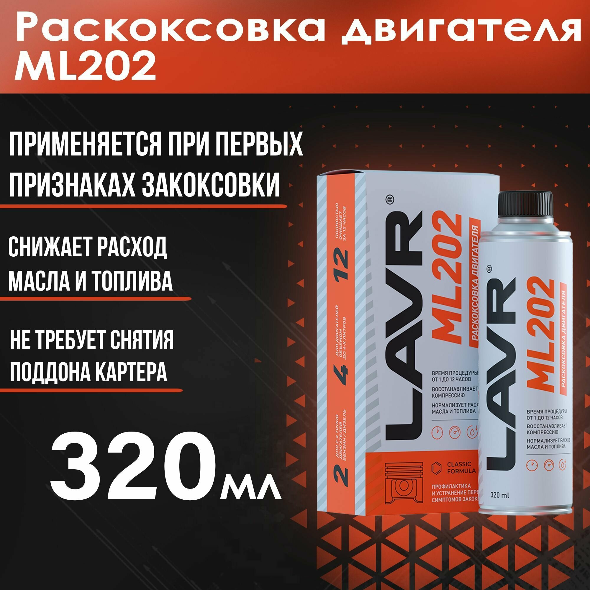 LAVR / ln2504 / Раскоксовывание двигателя ML-202 (для двигателей более 2-х литров) LAVR Engine carbon cleaner 330мл