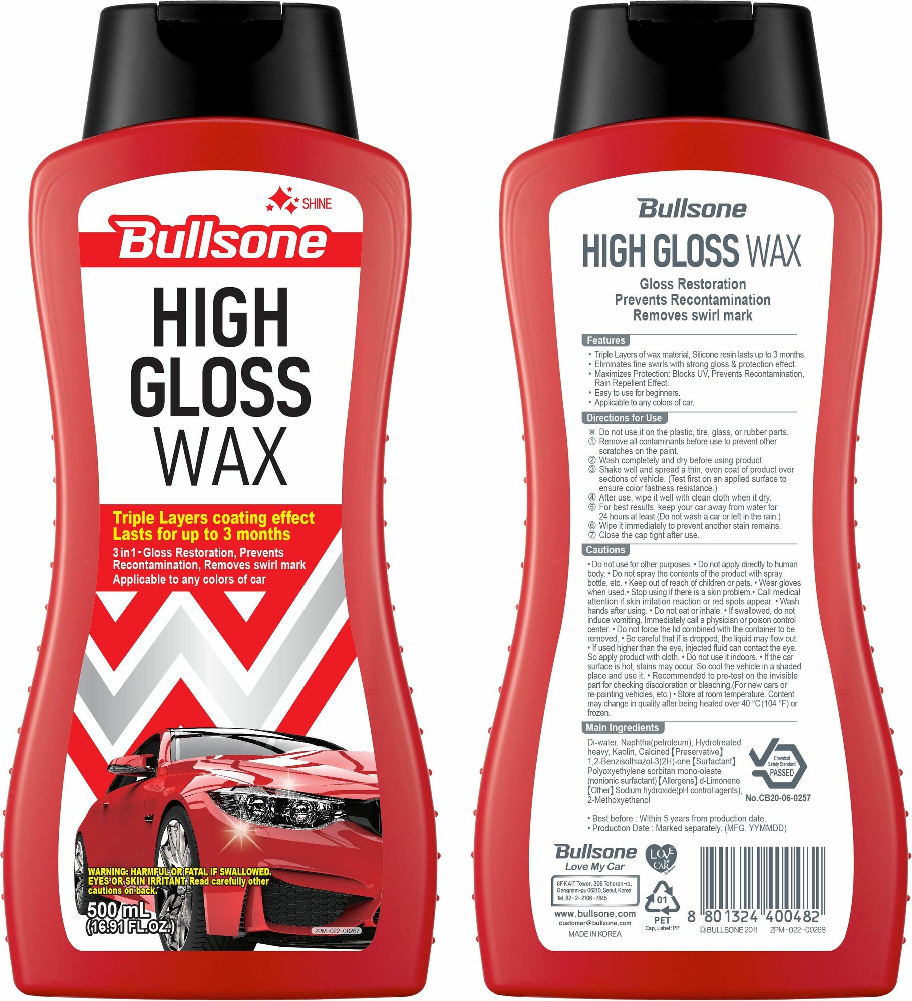 Купить Полироль защитный "High Gloss Wax", с эффектом жидкого стекла, 3-слойное покрытие, 500 мл BULLSONE, Корея