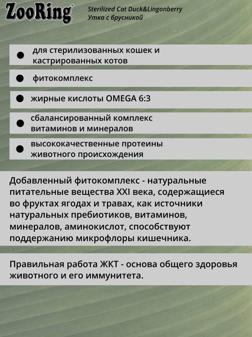 Сухой корм для стерилизованных кошек и кастрированных котов ZooRing с Уткой и Брусникой, 400 гр