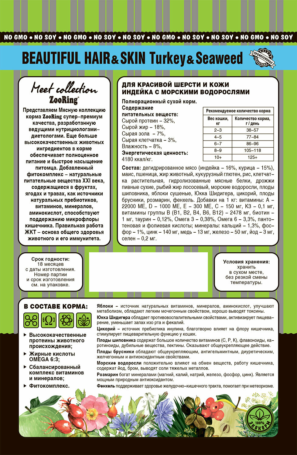 Сухой корм ZooRing Beautiful Hair&Skin Turkey индейка с морскими водорослями для кошек, 1,5кг