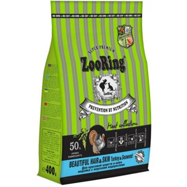 Сухой корм ZooRing Beautiful Hair&Skin Turkey индейка с морскими водорослями для кошек, 400г