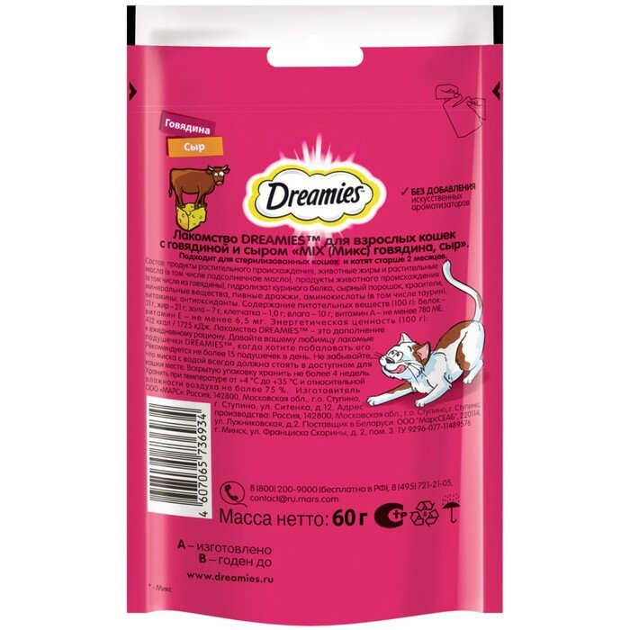 Лакомство DREAMIES для взрослых кошек с говядиной и сыром «MIX (Микс) говядина, сыр», 60г