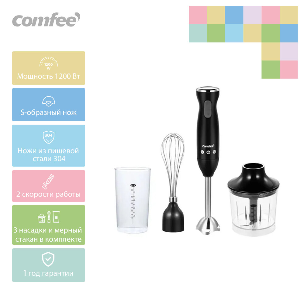 Блендер погружной Comfee CF-BL801, 1200 Вт, чаша 0,5 л, 3 насадки, 2 скорости, черный интересное: