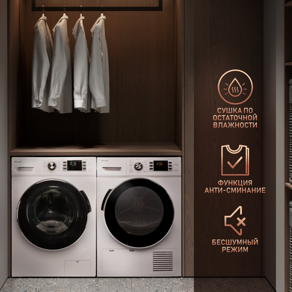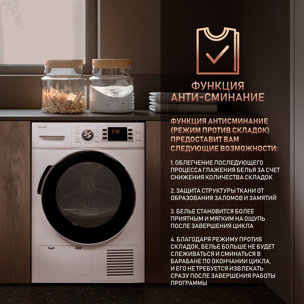 Сушильная машина Weissgauff WD 6148 D, 8 кг загрузка, Быстрая сушка, Режим освежить, Внутренняя подсветка интересное:
