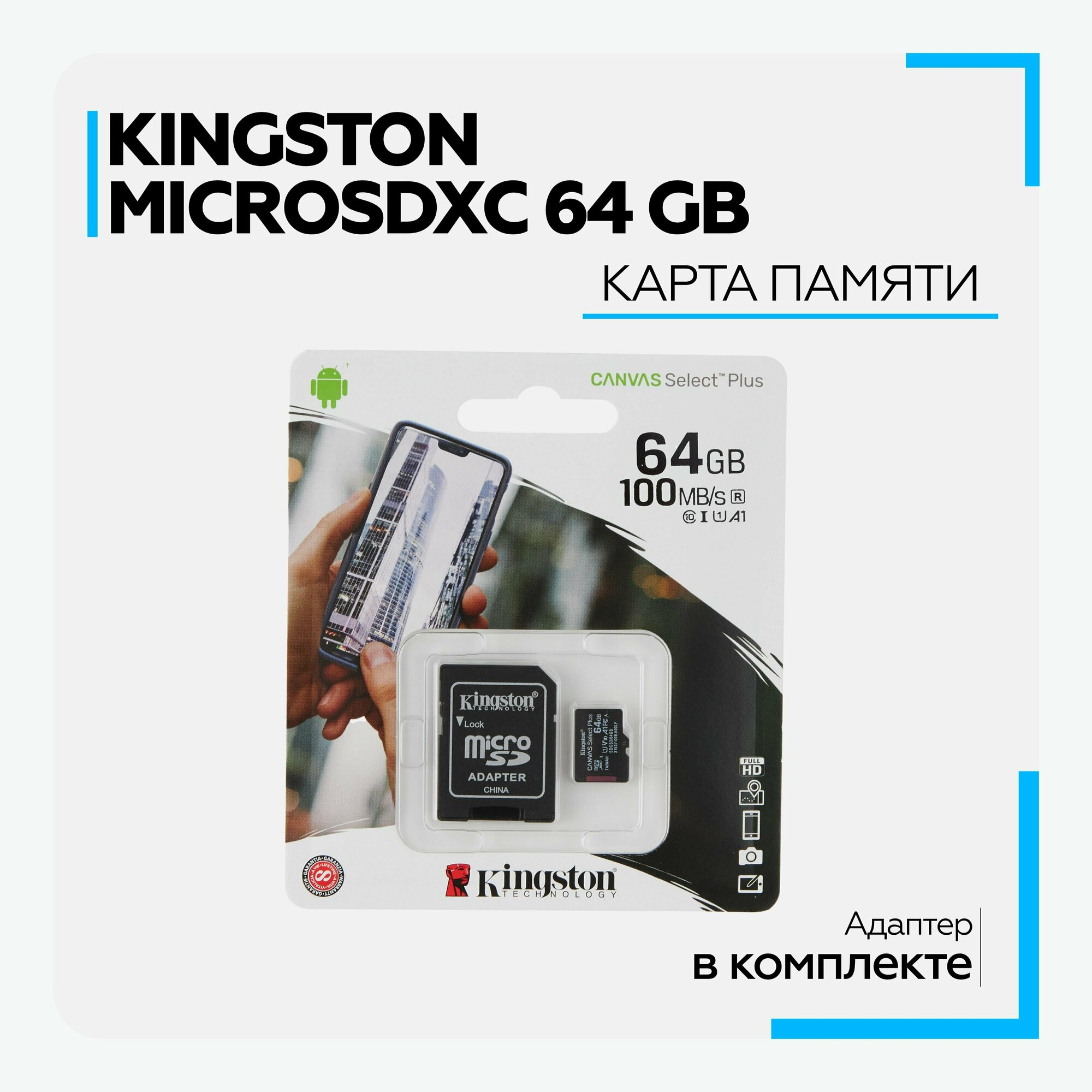 Карта памяти microSDXC 64 Гб, 100Mb/с, Kingston Canvas Select Plus, UNS-I, Class 10 (SDCS2/64GBSP)