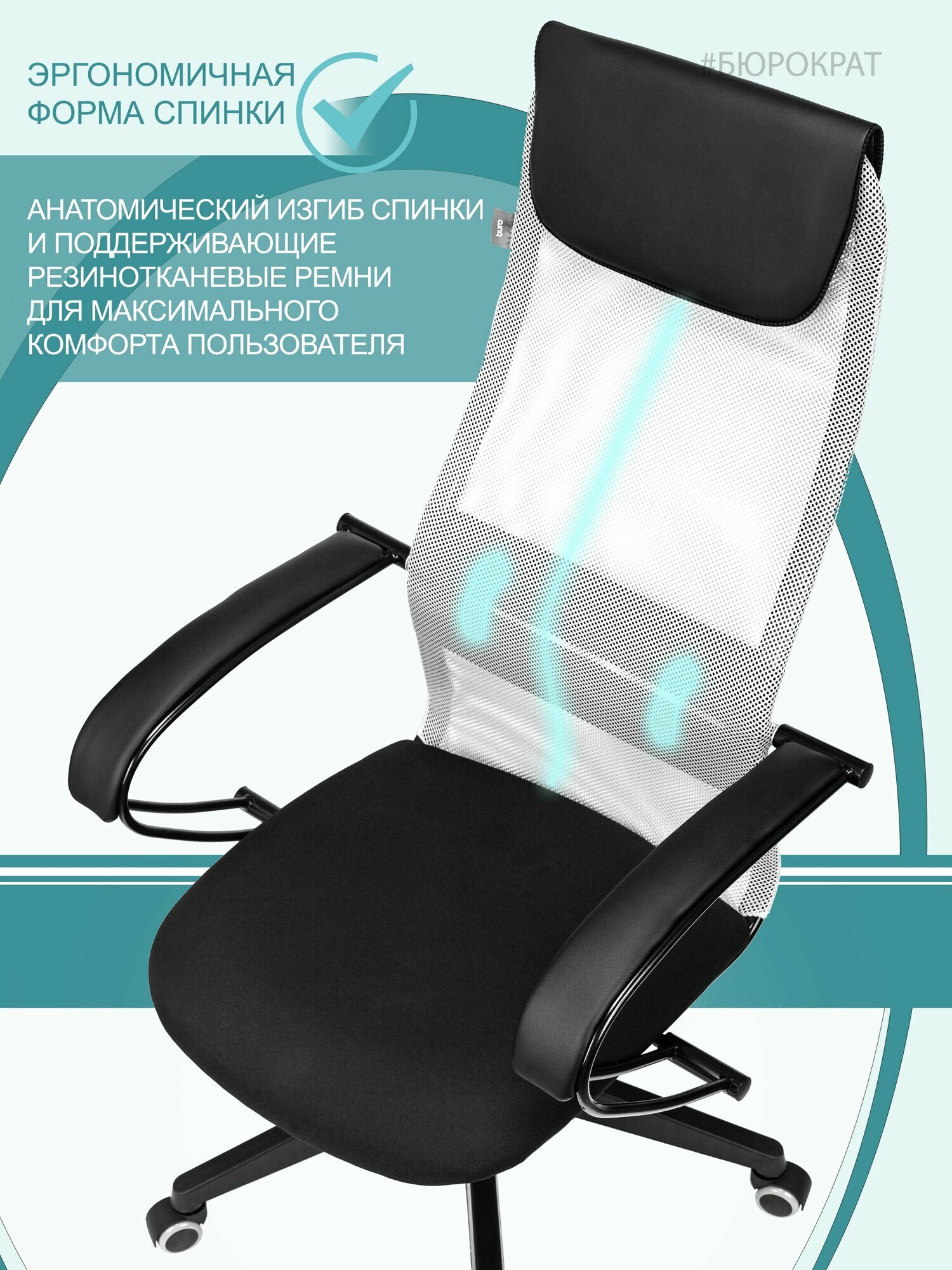 Кресло компьютерное Бюрократ CH-607, стул офисный на колесах, высокой спинкой из сетки, с подлокотниками, ткань