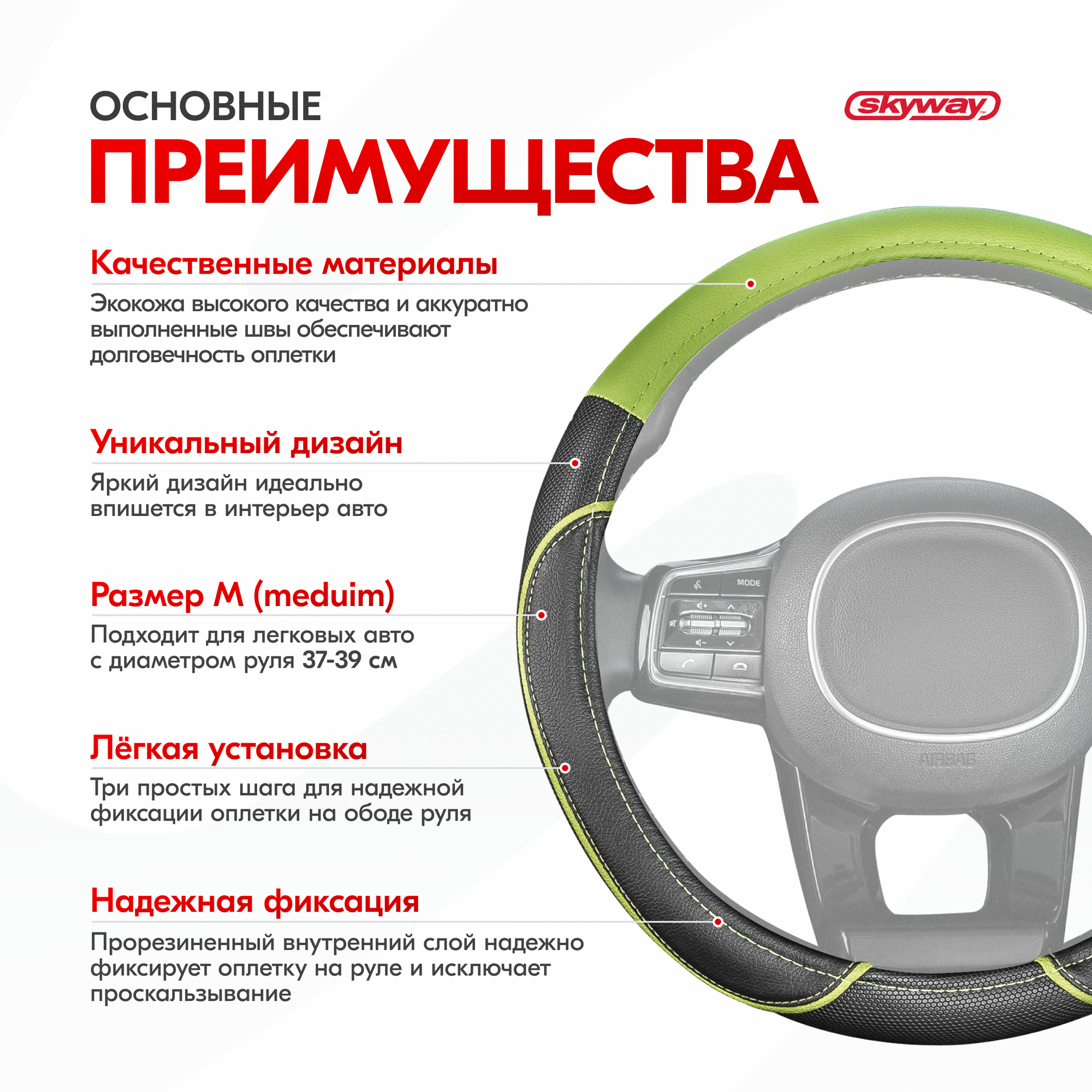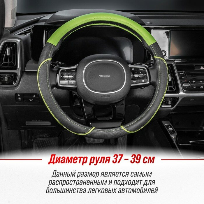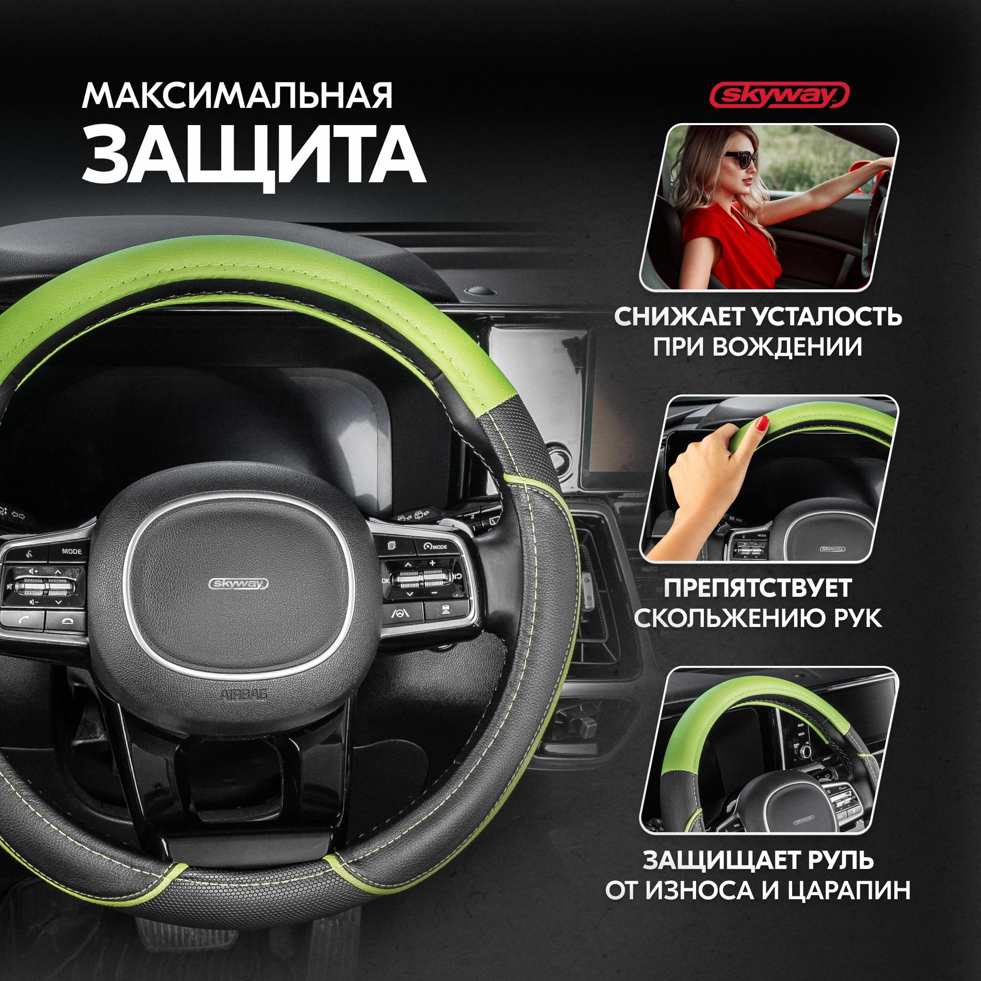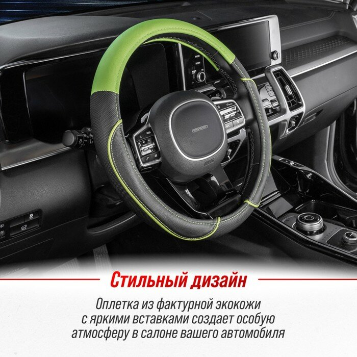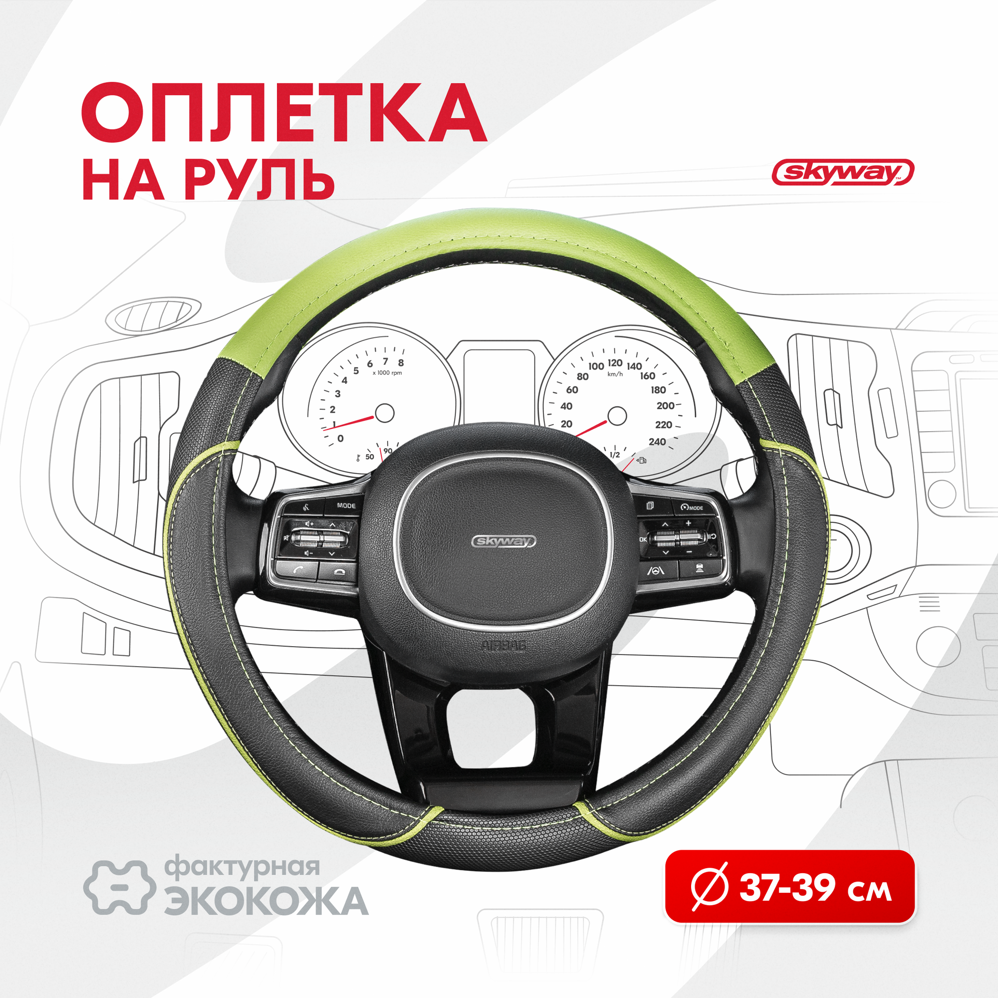 Купить Оплётка руля SKYWAY кожаная Черная с зеленой вставкой и полоской (M)