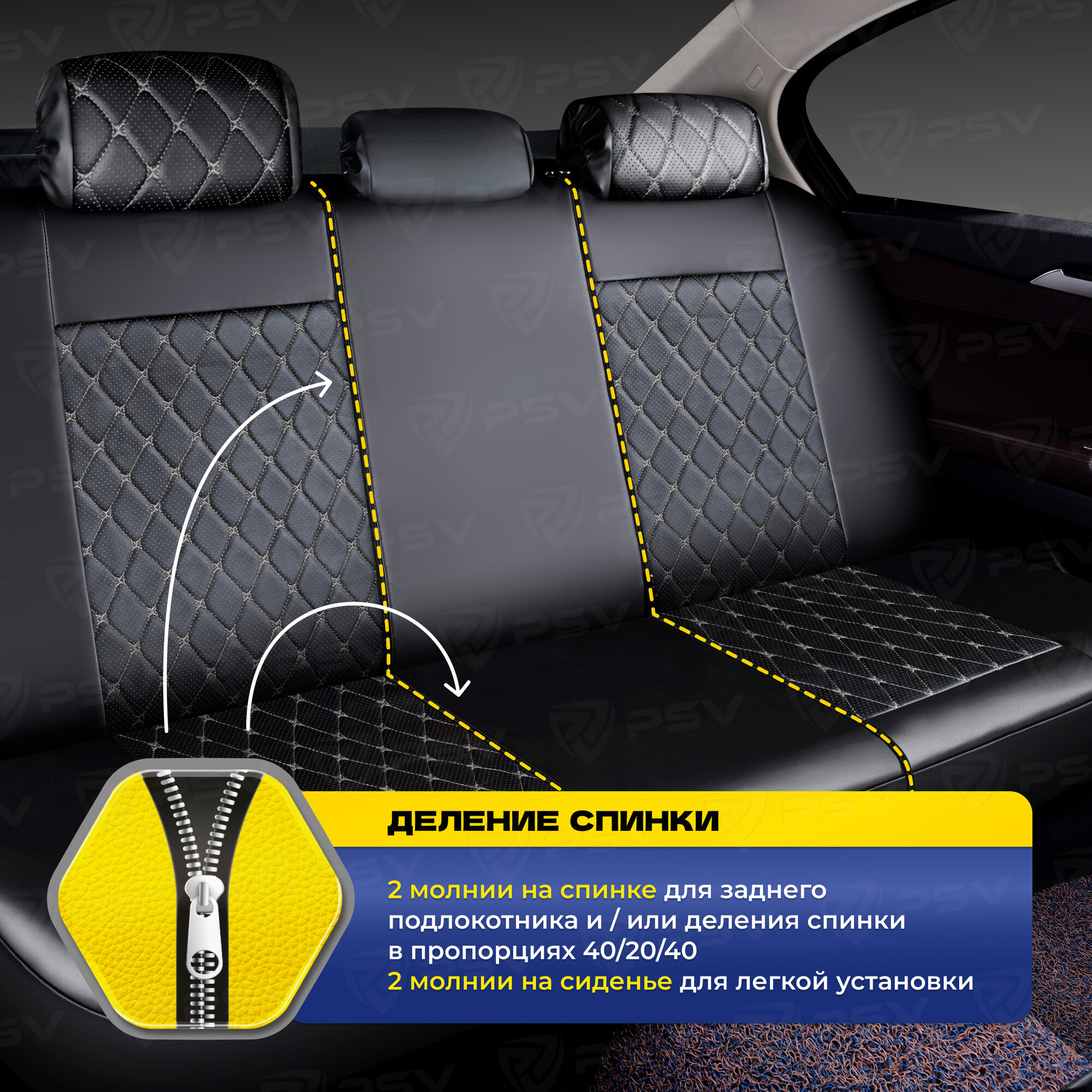 Чехлы в машину универсальные PSV Graf Next (Черный, ромб черный, отстрочка черная), велюр + экокожа, 136466