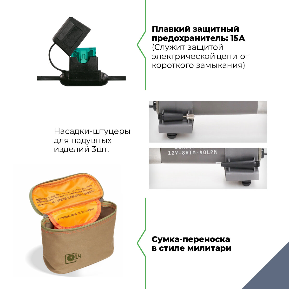 Компрессор 8 атм. 40 л/мин. 14 а. шланг 1,2 м. кабель 3 м. 12 в. сумка berkut r14