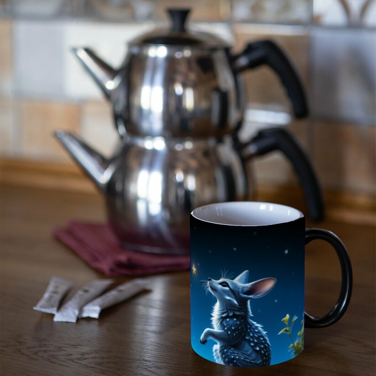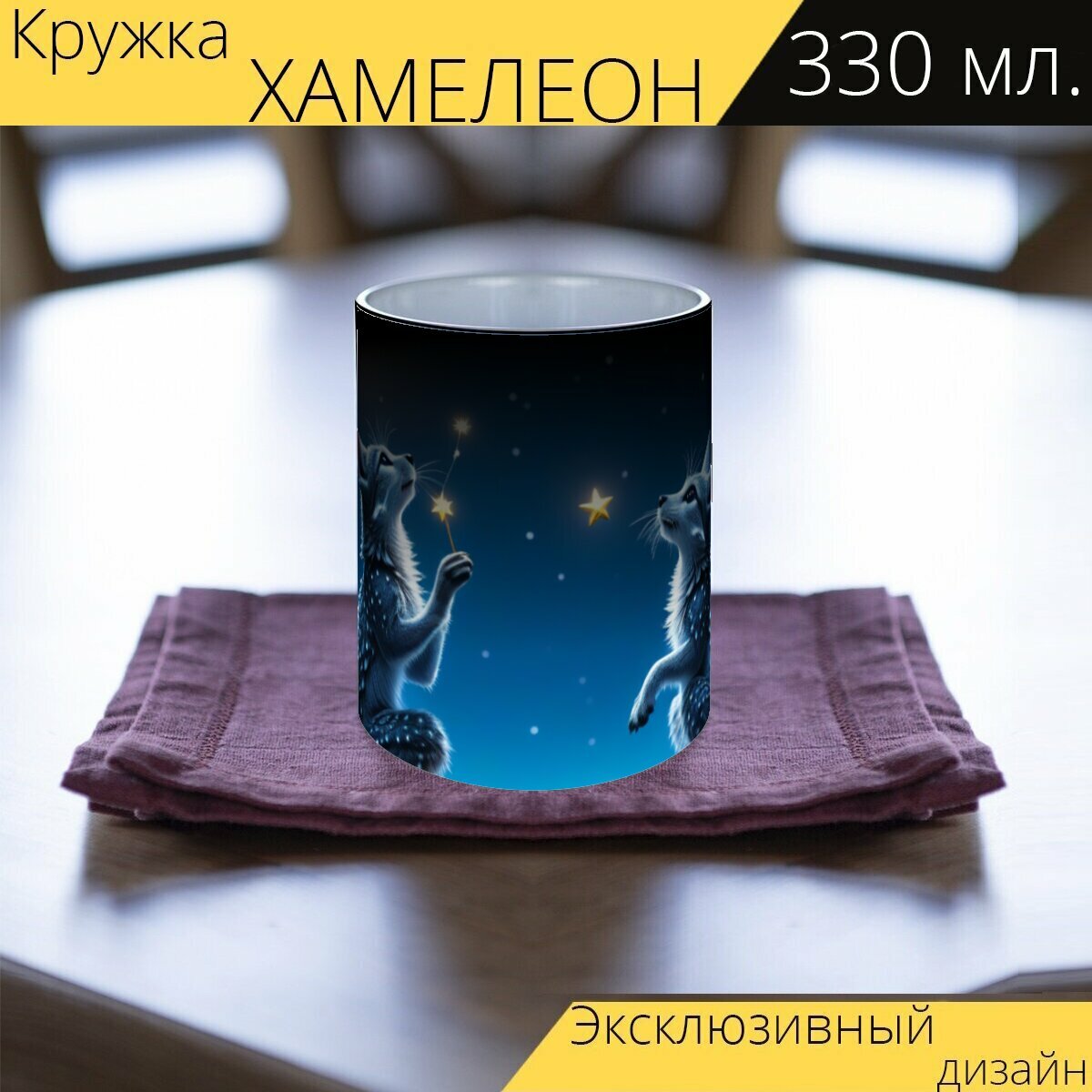 Кружка хамелеон с принтом "Сказочные существа загадывают желания возле луны" 330 мл. интересное: