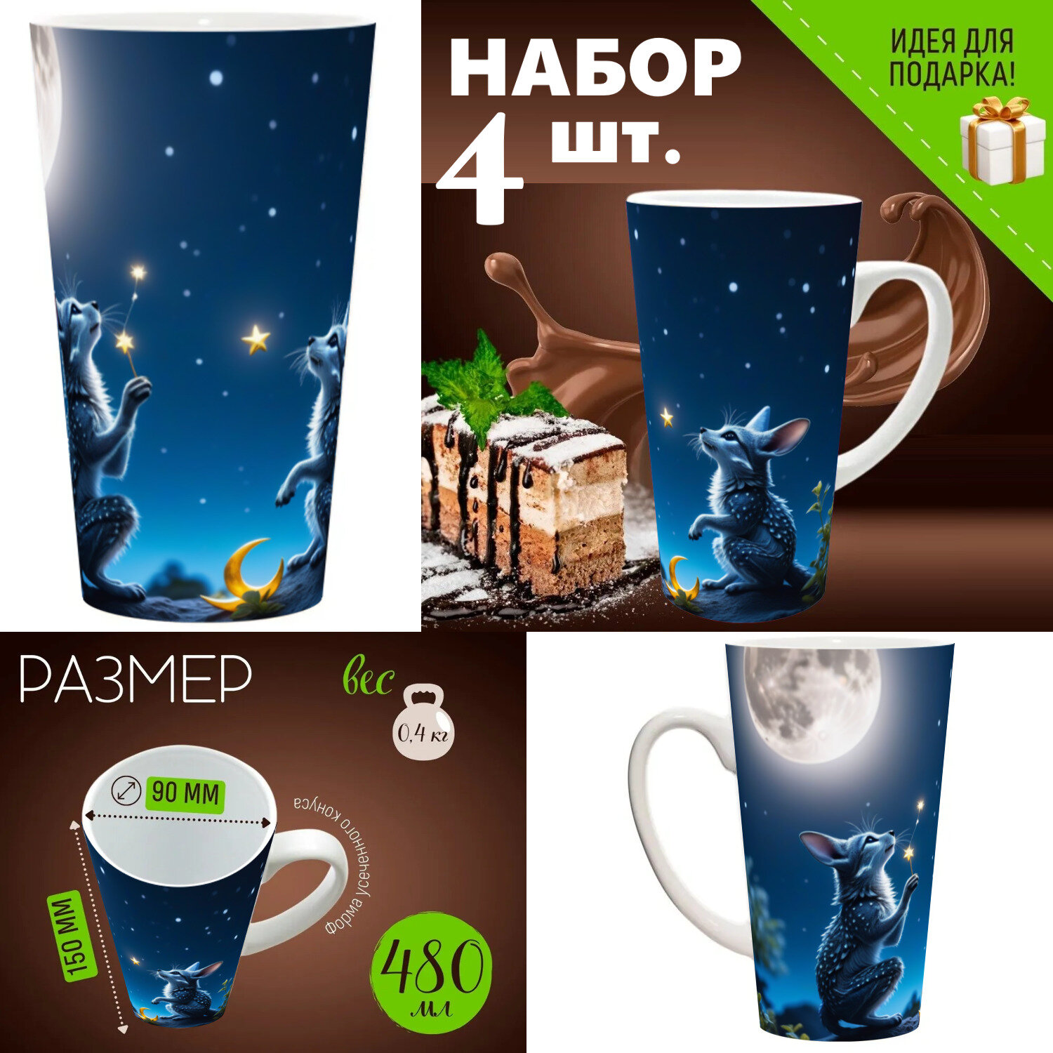 4 шт. Набор кружек с принтом "Сказочные существа загадывают желания возле луны" 500 мл. интересное: