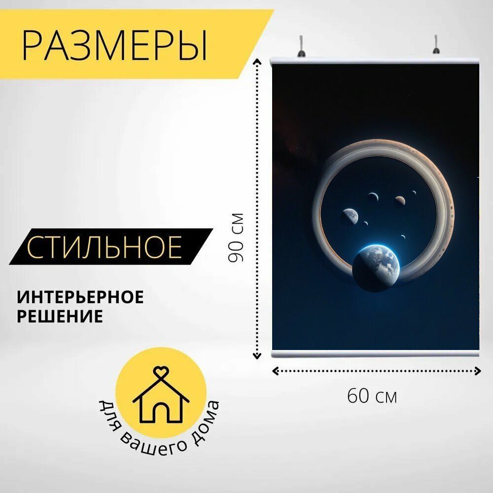 Картина на холсте "Планета с кольцами и множеством спутников" с подвесами 60х90 см. для интерьера на стену интересное: