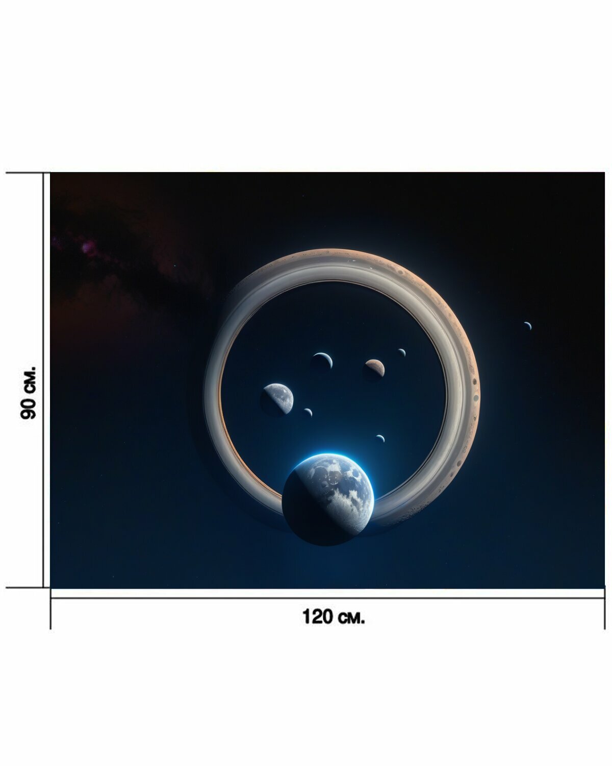Купить Картина на холсте "Планета с кольцами и множеством спутников" с подвесами 120х90 см. для интерьера на стену
