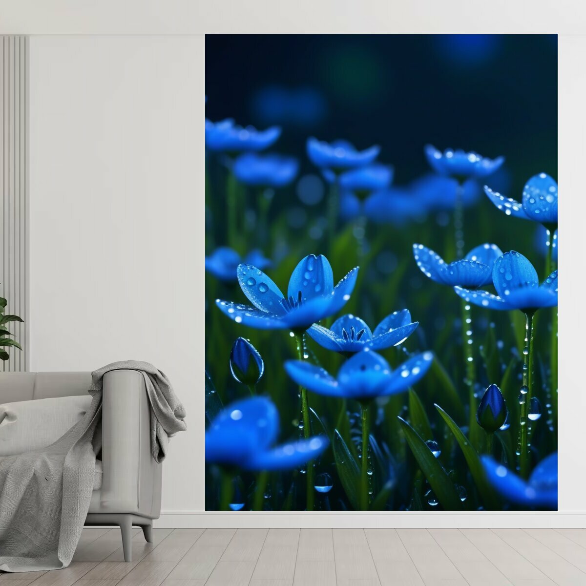 Фотообои "Ночной пейзаж с цветами и блестящими каплями росы" 300x270 см. флизелиновые на стену