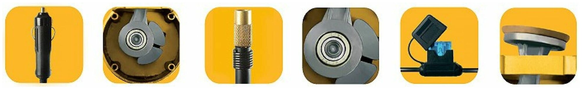 Латунное соединение шланга. Длинный шланг и шнур питания. Это очень удобно, снимает много ограничений при работе! Стравливание воздуха. Наличие чехла. Само по себе плюс, так как позволяет держать прибор в порядке. Наличие насадок и крокодилов для подключения к аккуму |